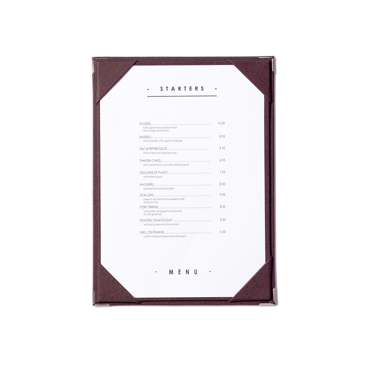 Your printed insert is held in place using corner mounts that match your chosen tariff board colour